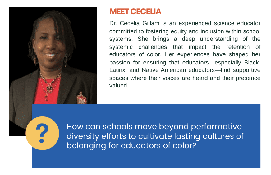 Cecelia is currently working to institutionalize accountability measures that prioritize belonging as a Project Team leader within the Beyond100K network. While her previous district projected a commitment to diversity, she recognized that their approach was largely transactional. She is exploring ways to integrate educator feedback into administrative evaluations, ensuring that belonging is not just a talking point but a fundamental metric of success. Cecelia shares, “My idea is aimed at cultivating a sense of belonging for Black and Brown educators by creating a framework for belonging within a school and holding administrators accountable for delivering.” Despite the setbacks encountered, she’s determined to end the STEM teacher shortage because she is deeply familiar with the data. Cecelia’s insights underscore the critical need to move beyond surface-level diversity initiatives and cultivate environments where educators of color feel genuinely valued and heard.