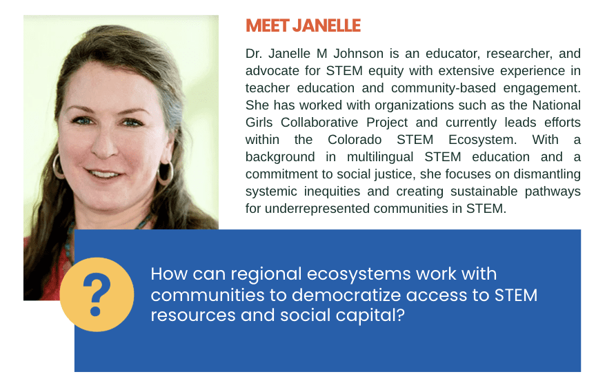 STEM ecosystems have the power to shift who holds influence in education by rooting opportunity in community leadership. Dr. Janelle M. Johnson, director of the Colorado statewide STEM Ecosystem, is at the forefront of this movement—working to ensure that equity isn’t just a value but embedded in structure and approach. She recognizes that static leadership roles in STEM fields often create systemic barriers to access and representation. Dr. Johnson describes the Ecosystem as designed to broaden access: “You don’t have to be a power player to engage – you have a voice at the table to tell your story, do the networking and access resources.” By treating community members as co-owners—not participants—her work makes STEM feel both accessible and accountable. She highlights how traditional models often fail to serve local needs, leading to what she terms “talent drain,” where students must leave their communities to pursue STEM opportunities. This intentional integration of STEM education with economic empowerment ensures that people can remain connected to and invested in their local communities.