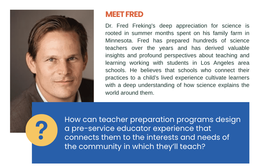 USC Rossier is embedded within the city of Los Angeles and their approach emphasizes the importance of leveraging the wealth of knowledge and skills in a child’s home. From the outset pre-service educators complete a variety of projects intended to build their understanding of the interests and needs of this diverse community. Pre-service educators immerse themselves as learners as they meet parents and administrators and understand their student’s strengths. Fred asserts, “if you can’t connect science content to the kids and what they bring to schools, they’re not going to learn.” Fred nudges his pre-service educators to continually reflect on who they are teaching, what science knowledge they already bring, and how to build upon it. By fostering a deep connection with the community, USC Rossier pre-service educators are equipped to create meaningful and impactful science learning experiences that resonate with students’ lives and backgrounds.